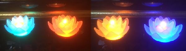 写真は、九州からの帰省がかなわない娘さんから送られた“盆提灯”です。蓮の形の灯りの色が変わり、とても美しくまさにお浄土の様子『仏説阿弥陀経』の「池中蓮華・大如車輪・青色青光・黄色黄光・赤色赤光・白色白光」を想像させてもらえるものです。 初めて拝見するものでした。