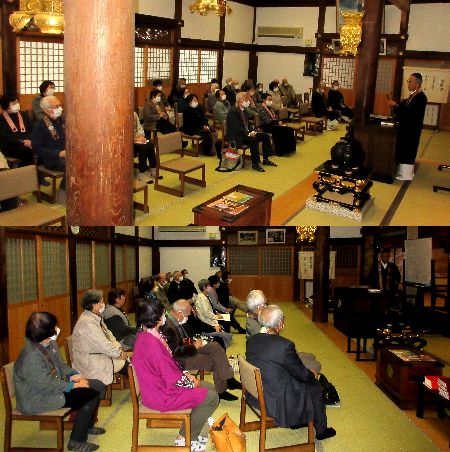 法座の日程を、昼席(1時半~)・夜席(7時半~9時)・昼席の二日間三席といたしました。江田島徳正寺護山智孝住職をご講師にお迎えして、春季永代経法座を共々にお勤めいたしました。護山師は、「お経を読み慣れてくると、どうですか?最初は何が書かれているだろうかと拝読していましたが、そのうち口慣れてくると、読むだけになってはいませんか?」と問いかけてくださいました。今回はあらためて、お経の趣意を分かりやすく話していただきました。特に『仏説観無量寿経』が、救いの目当てである凡夫を、韋提希(いだいけ)を通して明らかにされていることを、順を追ってお話くださいました。 夜席(写真下)にも、多くの方がお参りしてくださいました。