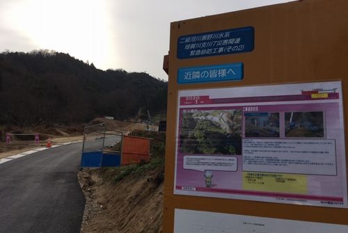 一昨年の豪雨被害で、土石流災害の起こった為角地区の砂防堰堤も進められています。写真の道は、工事のために山の中に作られた道路です。