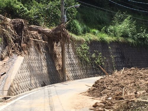お宮の西側道路(浄水場前)をふさいでいた土砂が、片側だけ撤去され車両の通行ができるようになりました。奥畑・水谷地区へアクセスできます。
